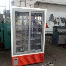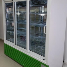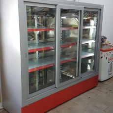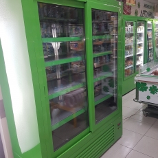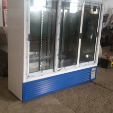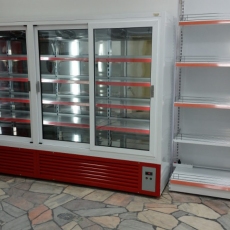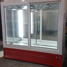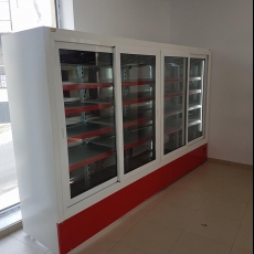 Вертикална (крайстенна) хладилна витрина с ширина 2.00 м , височина 1.95 м , дълбочина 0.65 м .Две големи плъзгащи се врати . LED осветление . Обдухване , вграден агрегат . Напълно самостоятелна и удобна за разместване . Изолирана с термо панели . Четири подвижни рафта . Цвят на предната решетка - по каталога на RAL .